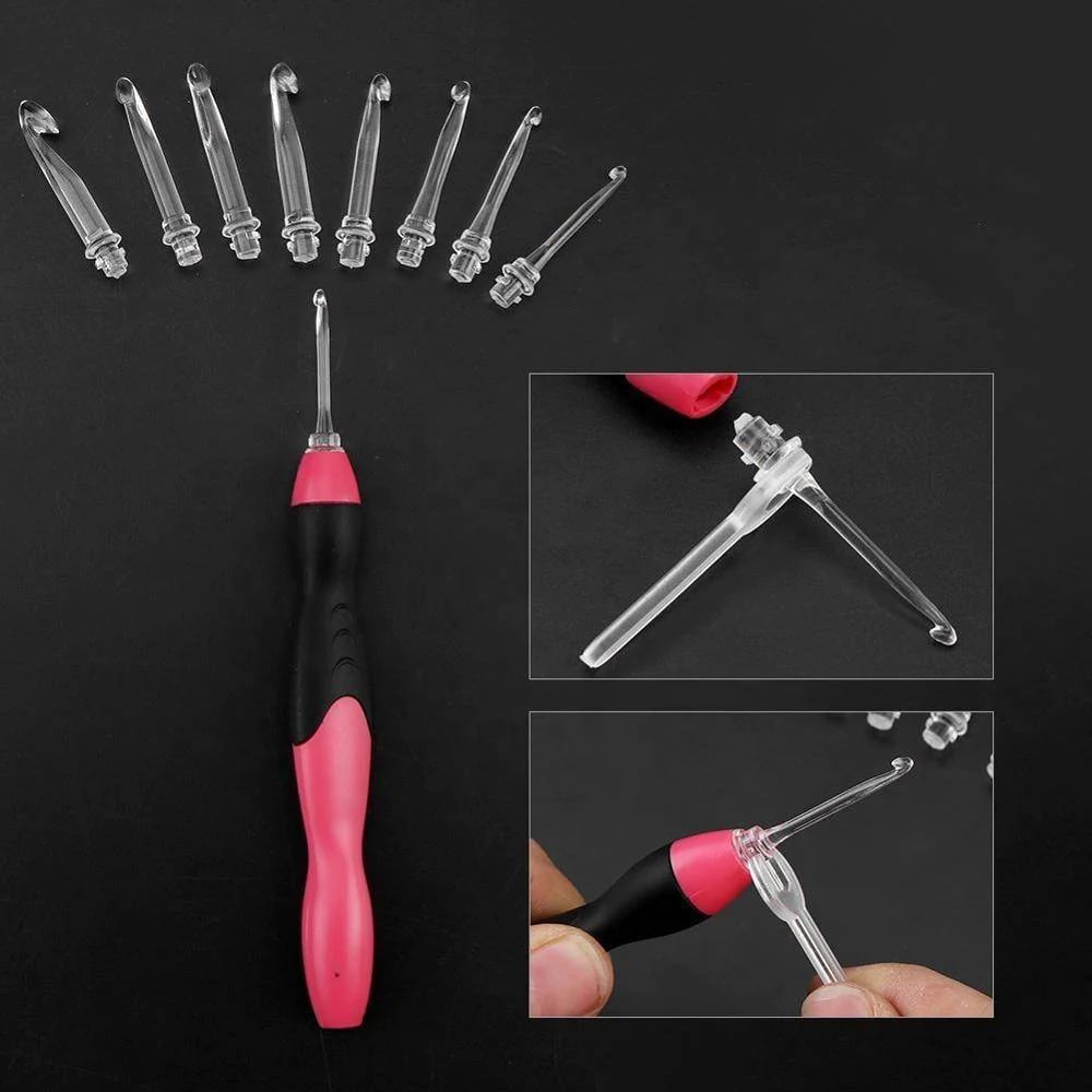 Com 9 agulhas de crochê intercambiáveis e marcadas individualmente para sua conveniência, a ferramenta com LED ainda vem com uma bolsa com zíper gratuita para fácil armazenamento.