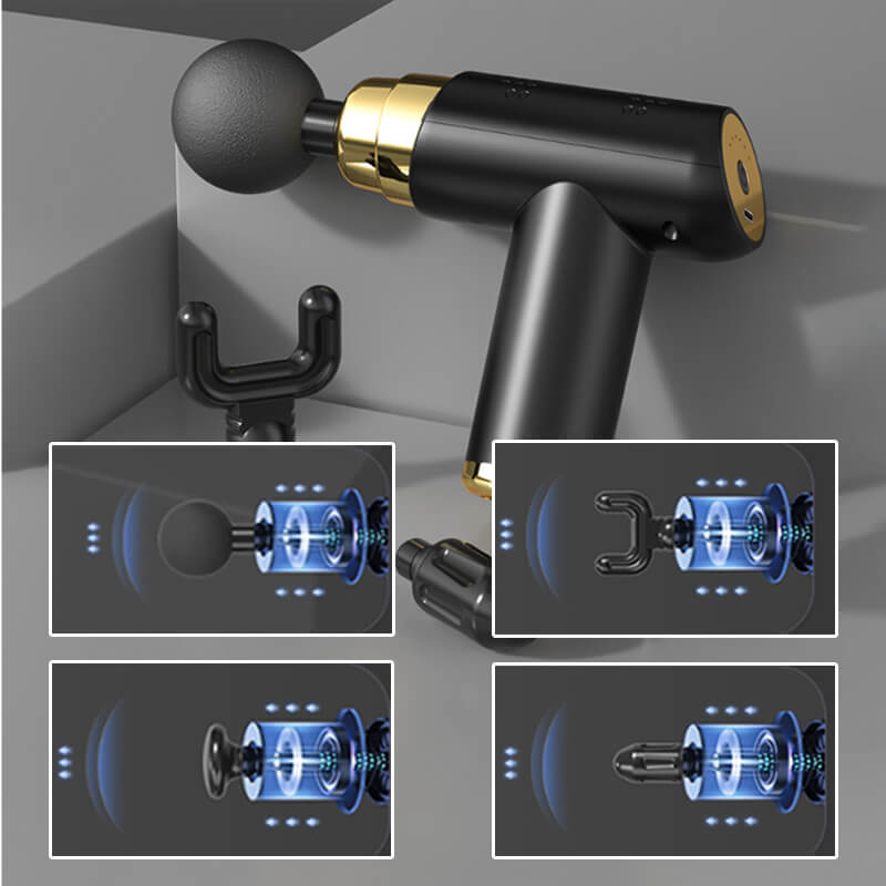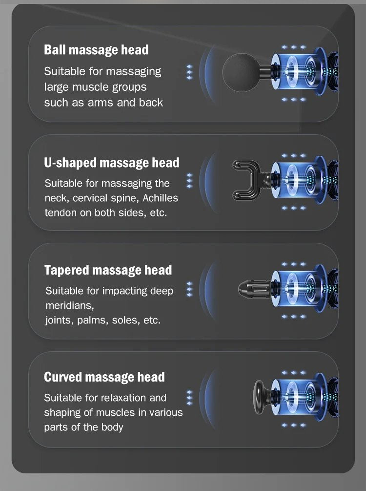 Cabeças intercambiáveis em 4 formatos para atingir grupos musculares específicos para recuperação mais rápida. Pode ser amplamente utilizado no ombro e pescoço, costas, pernas, solas e outras partes. A cabeça de massagem de silicone amigável à pele é mais resistente à sujeira do que os materiais de espuma comuns. Impermeável e fácil de limpar. Não se preocupe em suar ou sujar.