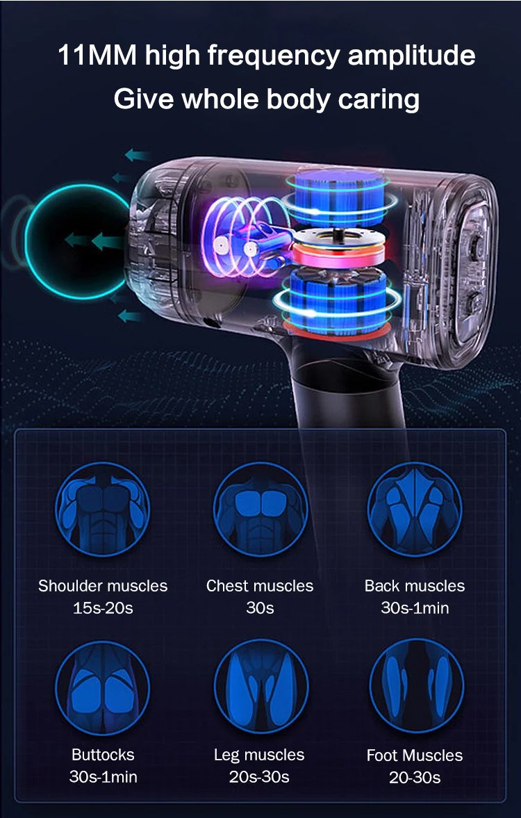 A pistola de massagem de percussão possui 4 velocidades avançadas e gera até 3200 rpm, e uma amplitude de vibração de 6mm. A pistola de massagem mini quebra nós e relaxa músculos tensionados, penetrando profundamente e aliviando grupos musculares de difícil acesso.
